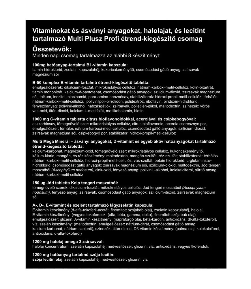 Multi Profi Plus koostuu huolellisesti valikoiduista ainesosista. Tuote sisältää erilaisia vitamiineja ja kivennäisaineita, jotka ovat peräisin luonnollisista lähteistä. Jokainen annospussi on suunniteltu tarjoamaan yksinkertainen lisäravinne päivittäiseen käyttöön ilman erityisiä terveysväitteitä.